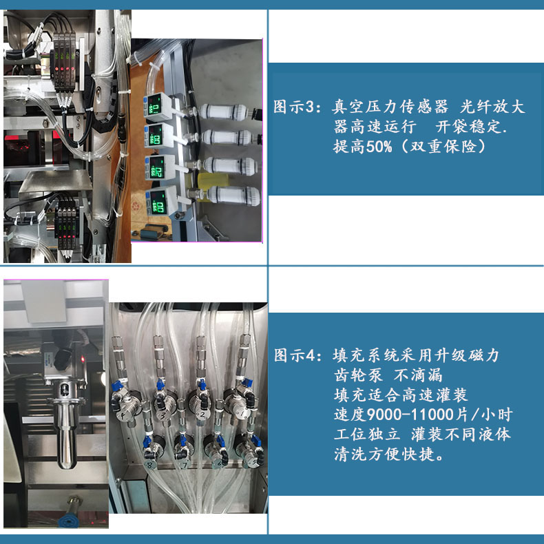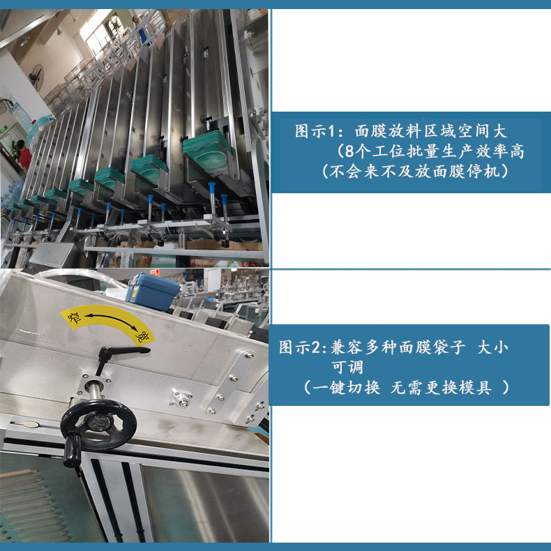 2.全自動(dòng)面膜機(jī): | 充填精華液,再對充填完精華液的面膜袋進(jìn)行封口和打碼。 |