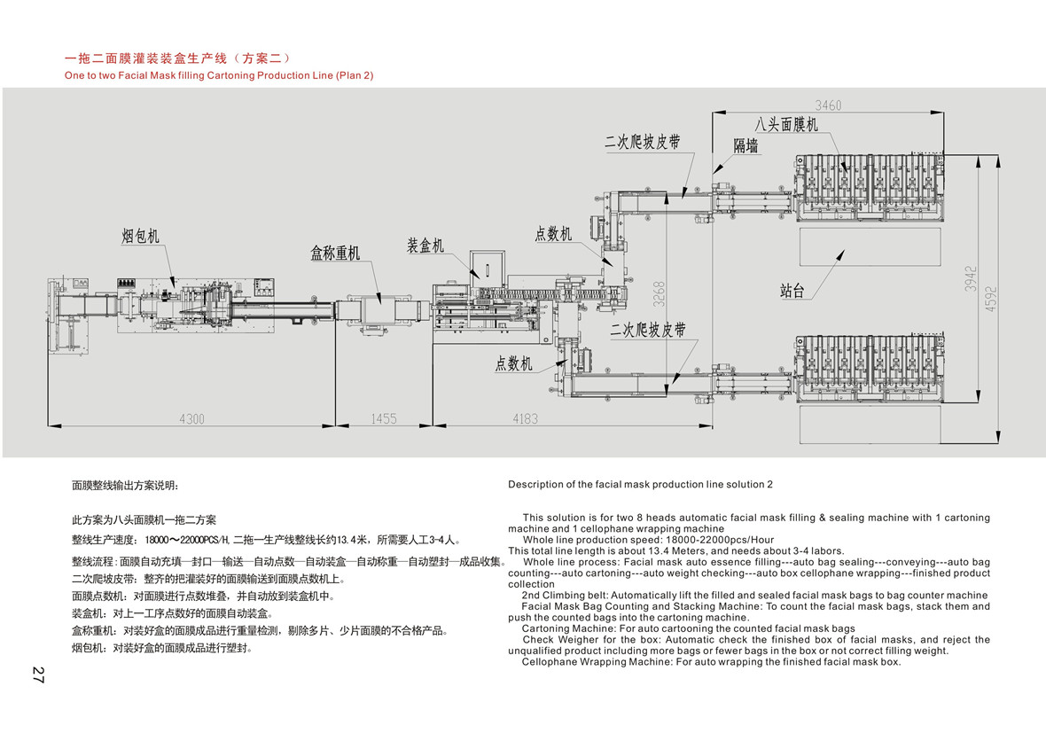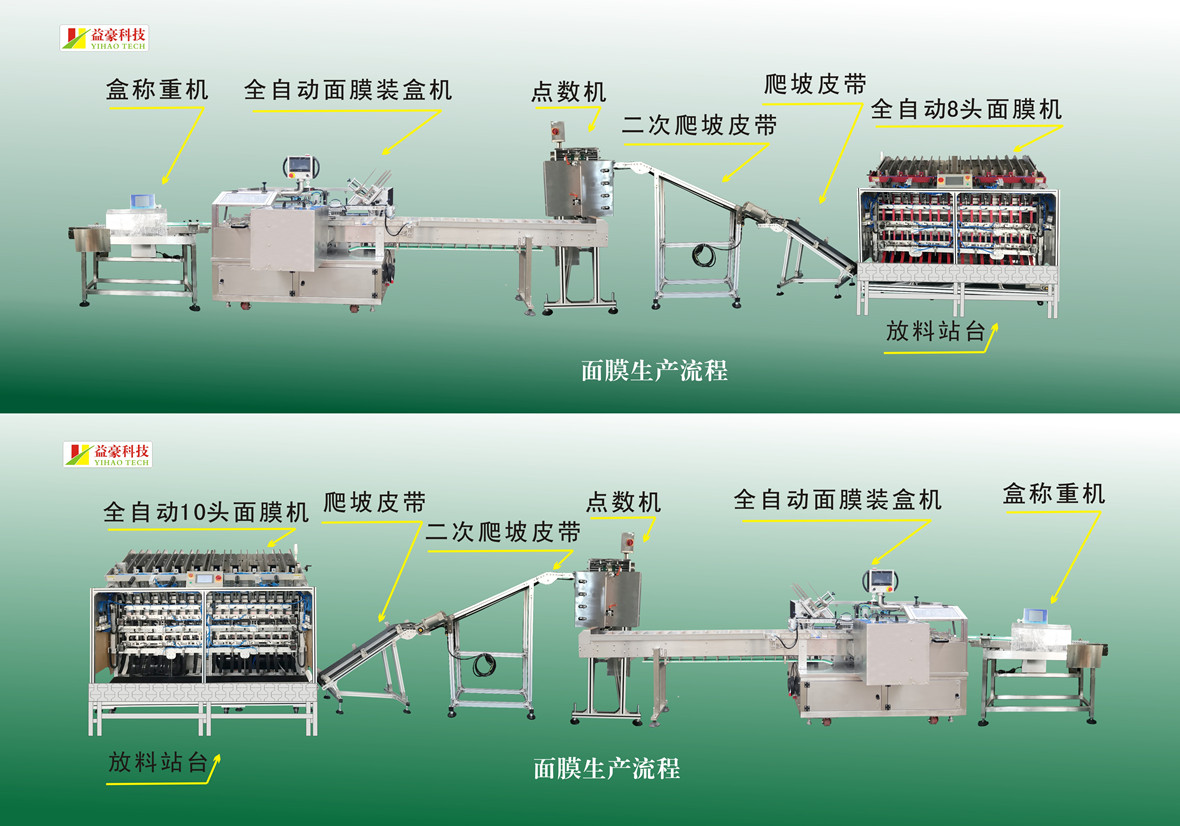 整線流程:面膜自動(dòng)充填一封口一輸送一自動(dòng)點(diǎn)數(shù)-自動(dòng)裝盒-自動(dòng)稱重一自動(dòng)塑封一成品收集,二次爬坡皮帶:整齊的把灌裝好的面膜輸送到面膜點(diǎn)數(shù)機(jī)上。面膜點(diǎn)數(shù)機(jī):對面膜進(jìn)行點(diǎn)數(shù)堆疊,并自動(dòng)放到裝盒機(jī)中。裝盒機(jī):對上一工序點(diǎn)數(shù)好的面膜自動(dòng)裝盒。