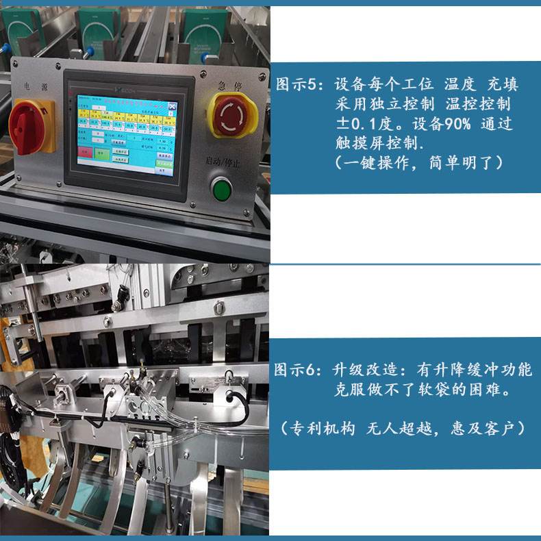 1、自動下袋、自動填充、自動封口、打碼、成品輸出、自動計數(shù),無袋不充填,無袋不封口;